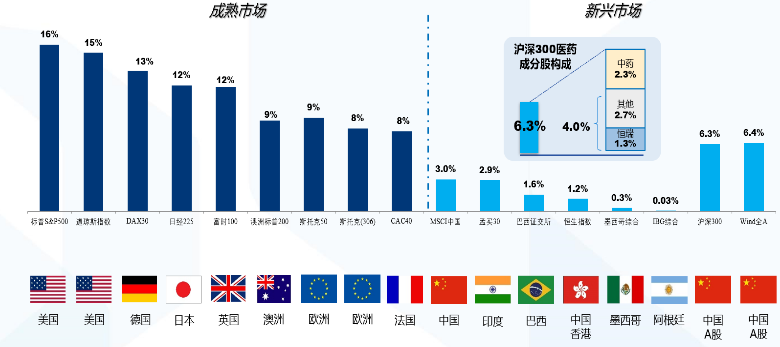 中国医药生物行业市值权重偏低,呈现新兴市场特征: