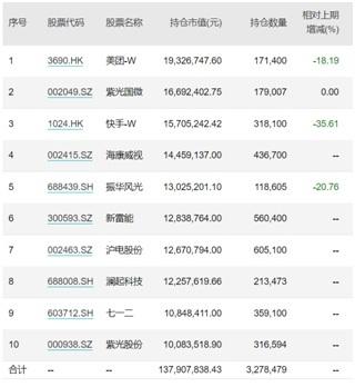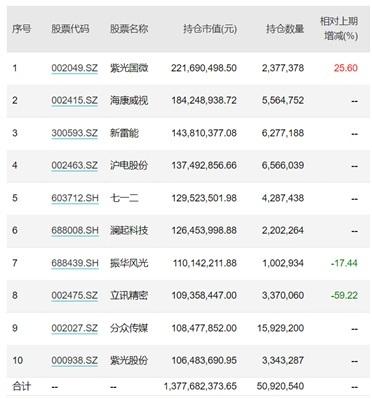 新进前十大的个股包括了海康威视、新雷能、沪电股份、七一二、澜起科技、分众传媒和紫光股份。