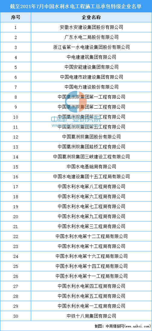 目前,我国水利工程企业大多以国有企业为主,其他非公有制、混合经济所占的比重较少。截至2021年7月21日,全国特级资质数量达915项,分别归属720家企业。中铁十八局集团有限公司仍是唯一一个“五特”企业,坐拥建筑工程、公路工程、铁路工程、水利水电工程和市政公用工程5个特级资质。中国电力建设股份有限公司和中国葛洲坝集团股份有限公司在水利工程行业中占据绝对的优势。