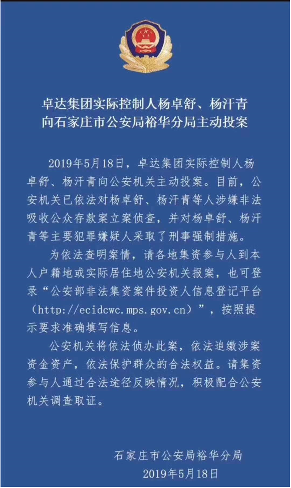 后一周,也就是2019年5月18日晚,官方消息就揭露了一件重大案件:杨卓舒和其子杨汗青向公安机关投案自首,涉嫌非法吸收公众存款立案侦查和刑拘。