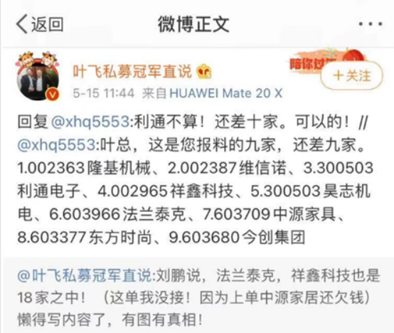 昔日私募冠军叶飞惨遭黑吃黑,一气之下爆料中源公司与盘方“坐庄赖账”。后续事件持续发酵,继爆料中源家居涉嫌操纵股价之后,5月14日中午时分,充满争议的私募大佬叶飞发布微博称,“计划爆料18家上市公司”,其相继点名了ST华钰(601020.SH)、东方时尚(603377.SH)、维信诺(002387.SZ)、昊志机电(300503.SZ)、隆基机械(002363.SZ)等A股上市公司。