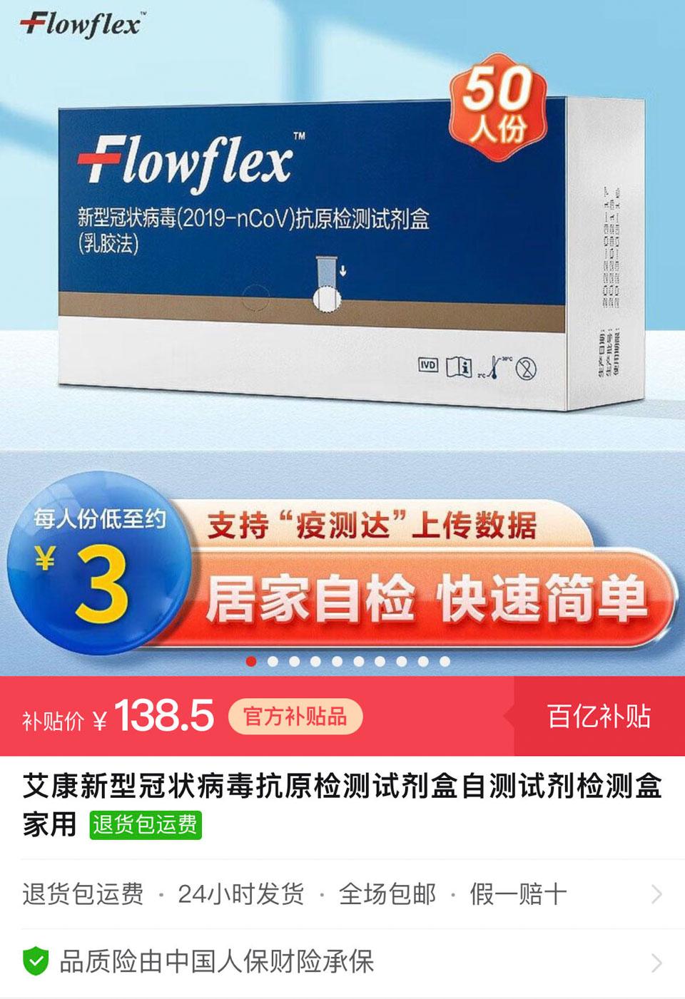 2022年12月5日,某电商平台“百亿补贴”之下一款艾康抗原检测试剂最低价仅为138.5元一盒(50人份),折合2.77元一人份。 (网络截图/图)