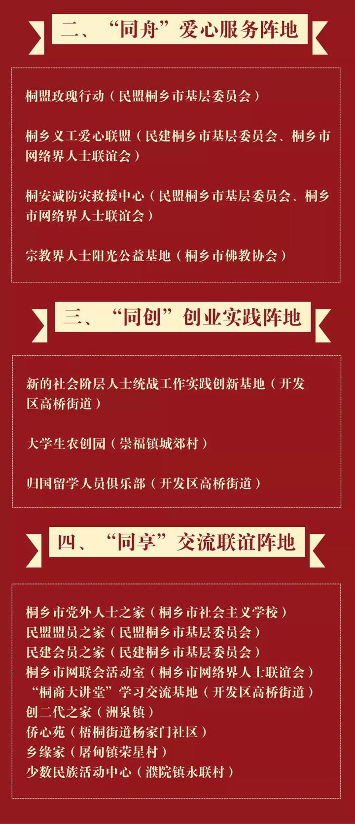 现场,对“同心”服务建功阵地、“同舟”爱心服务阵地、“同创”创业实践阵地、“同享”交流联谊阵地等共计27个具有桐乡特色的“四同”统战工作阵地进行了授牌。