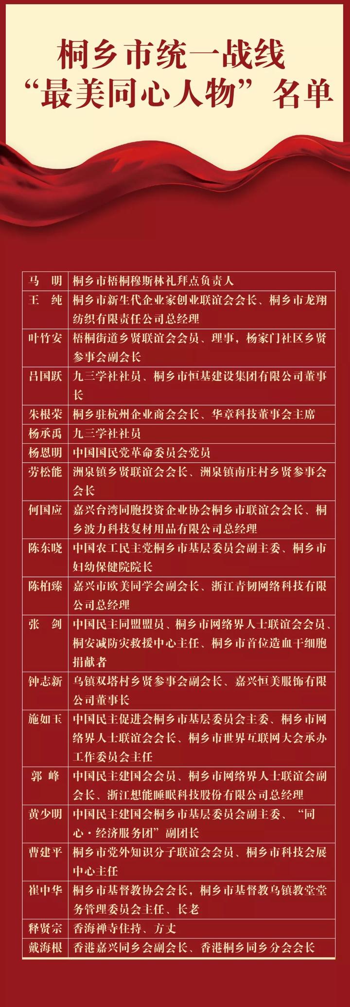 今天(9月20日)下午,我市举行统一战线庆祝新中国成立70周年暨多党合作制度确立70周年颁奖大会。全市统一战线成员齐聚一堂,同心颂祖国、共筑中国梦。嘉兴市委常委、统战部长张仁贵,桐乡市领导盛勇军、于会游、张林洪、潘川弟等出席会议。