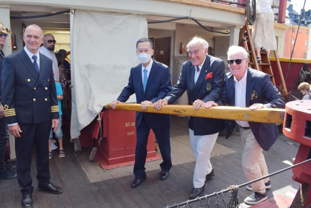 崔大使指出,今天中瑞联系更加紧密、合作更加广泛。历史上的“黑铅、粗绒换茶叶、瓷器”贸易已拓展为通讯、医药、金融、交通运输、绿色低碳等各领域合作。去年中瑞贸易额达209亿美元的历史新高,中瑞经贸务实合作为两国人民带来更多实实在在的利益。“哥德堡号”此次赴华之旅不但能使我们回顾历史、重温友谊,更将通过文化和贸易的纽带为中瑞两国务实合作探索新模式,搭建新平台,助力两国关系健康发展,祝愿“哥德堡号”一帆风顺,平安抵达中国。