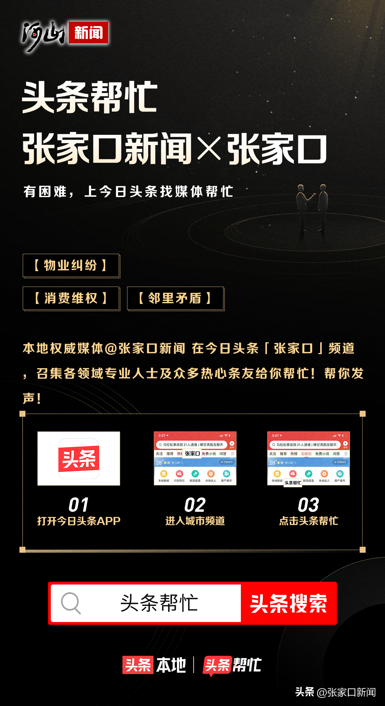 2.打开今日头条APP搜索【头条帮忙】填写求助信息,@头条帮忙@张家口新闻