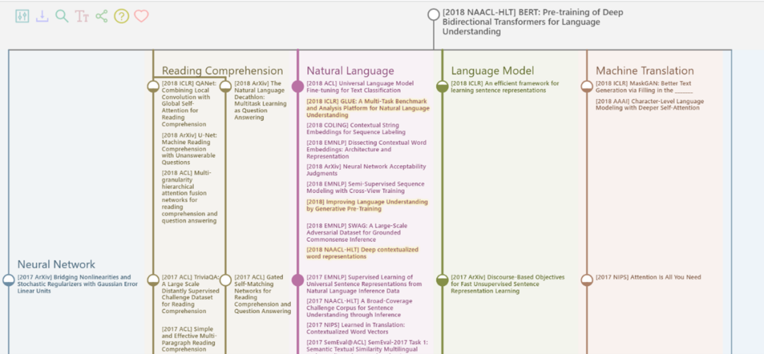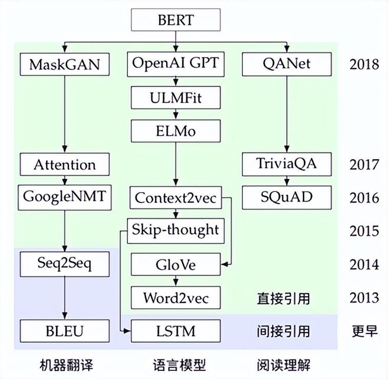 以知名 NLP 研究论文“BERT:Pre-training of Deep Bidirectional Transformers for Language Understanding”为例,BERT 对于预训练模型、文本向量、序列编码等方法的使用来源于语言模型这一方向上的 ELMo、Word2vec、LSTM 等工作中,而 MLM、Transformer 等内容则可以追溯到机器翻译领域中的 MaskGAN、Attention is all you need 等文章。