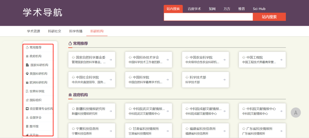学术资源收集了一些科研活动中常用的工具、网址和资源,包括学术搜索、文献数据、共享资源、期刊出版、学术工具、科研软件、科研数据、设施仪器、超级计算、基金项目、统计年报、科学计量、人才计划、奖励荣誉、专利标准等等。可以说是集百家之大成,咱们常用的学术资源在这里面都能找到。