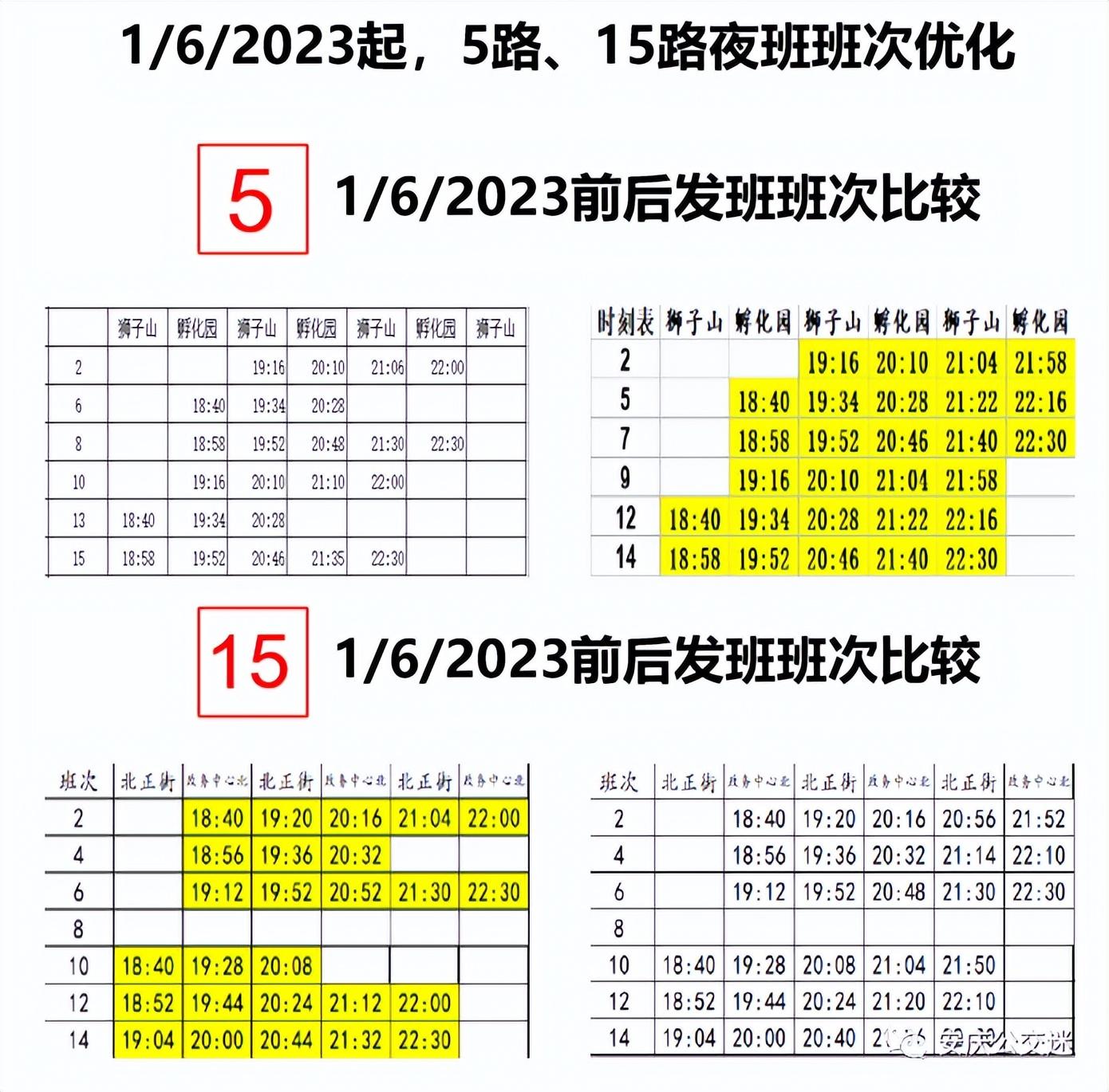 公交5路、15路的夜班班次间隔将作出优化调整,具体安排为:
