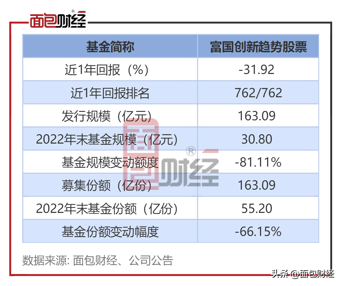 富国创新趋势股票的发行规模约163.09亿元(对应募集份额约163.09亿份)。2022年四季度末,该基金的基金资产净值约为30.80亿元、基金份额总额约为55.20亿份,分别下降约81.11%、66.15%。