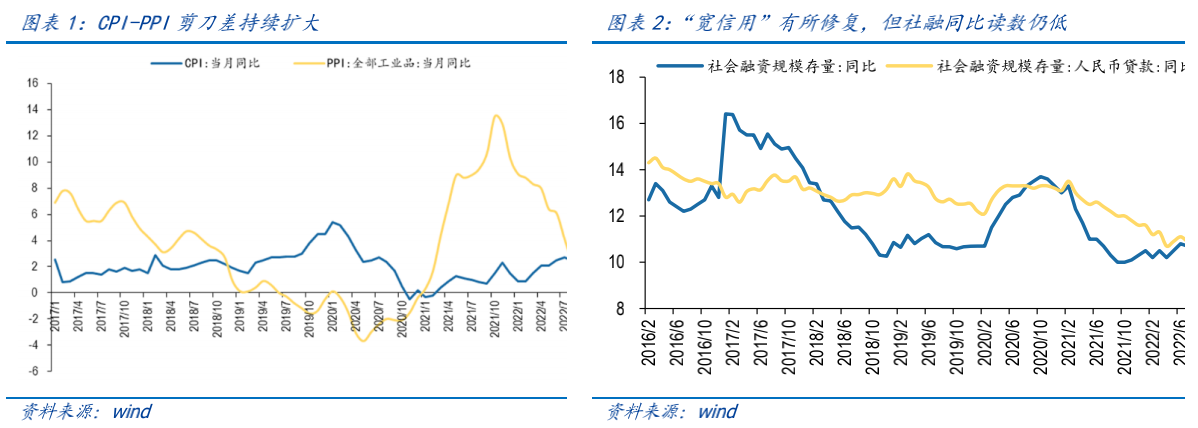 8月CPI为2.5%,PPI为2.3%,分别较上月回落0.2和1.9个百分点,显示当前经济通胀压力较小,为货币政策创造良好的弱通胀环境。PPI的持续回落舒缓了制造业投资不足的问题,CPI-PPI剪刀差持续扩大,有助于利润从上游向下游制造业、消费行业转移,利于消费、制造业复苏。在全球高通胀的背景下,中国的通胀形势总体相对温和,下半年“外紧内松”格局将延续。