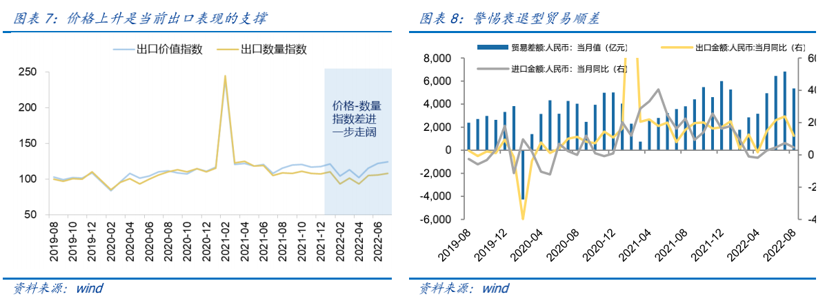 8月我国进出口总值3.71万亿元,增长8.6%,其中,出口2.12万亿元,同比增长11.8%,较前值23.9%显著回落;进口1.59万亿元,同比增长4.6%;贸易顺差为5359.1亿元,同比增长40.4%,环比减少1467.8亿元,海外衰退下出口对经济拉动的压力有所加大。除开去年高基数效应外,出口增速下滑的背后或延续7月海外通胀“价升”+实际外需“量缩”的趋势,未来需警惕内需、外需双弱的“衰退型顺差”格局,出口对经济增长的实际拉动力可能会减弱,外汇储备小幅收缩,叠加中美利率倒挂下流动资金对汇率破7的担忧,市场波动有所加剧。