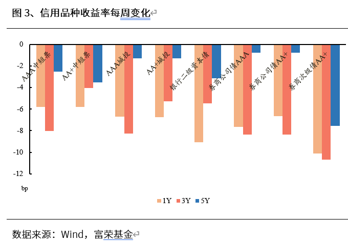 信用债收益率曲线整体下行2~8bps,信用利差下行3~7bps。