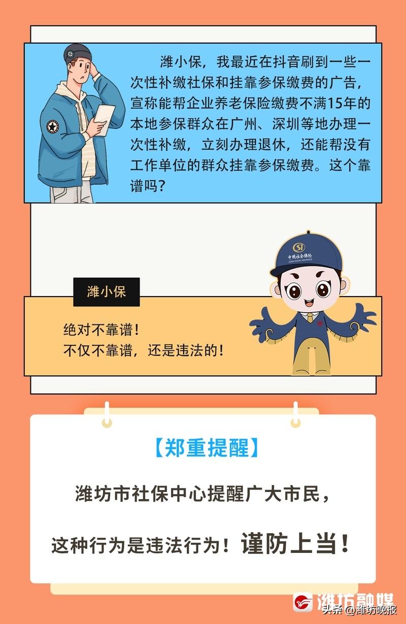 “我最近在抖音刷到一些一次性补缴社保和挂靠参保缴费的广告,宣称能帮企业养老保险缴费不满15年的本地参保群众在广州、深圳等地办理一次性补缴,立刻办理退休,还能帮没有工作单位的群众挂靠参保缴费。这个靠谱吗?”对此,潍坊市社保中心工作人员表示这种行为绝对不靠谱,而且还是违法行为,广大市民一定要谨防上当。
