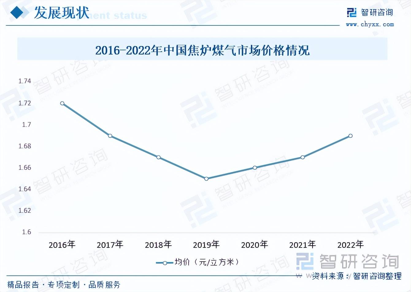 在国家政策的推动下,我国焦炉煤气行业回收率一直保持良好的增长趋势,焦炉煤气制天然气一举多得,既能提高焦炉煤气综合利用率,也能降低天然气对外依赖度,还能减少二氧化碳排放。目前我国已具备大力发展焦炉煤气制天然气的优势,随着国家对其重视度提升,未来几年我国焦炉煤气制天然气将迎来项目密集投产期,需求市场增长预期将成为推动产业价格上扬的重要动力。2022年中国焦炉煤气市场结构为1.69元每立方米,从2019年期整体价格呈上涨的趋势。