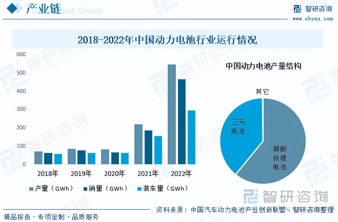 动力电池是纯电动汽车行业的核心组成部件,2020年之前,我国动力电池行业产销量及装车量整体趋于稳定,增长较为缓慢,2021年以来,随着我国新能源汽车飞速发展以及我国电池厂商新建产能得到逐步释放的带动下,我国动力电池行业产销量及装车量也随之大幅增长。据资料显示,2022年我国动力电池产量达545.9GWh,同比增长148.5%;销量为465.5GWh,同比增长150.3%;装车量为294.6GWh,同比增长90.7%。