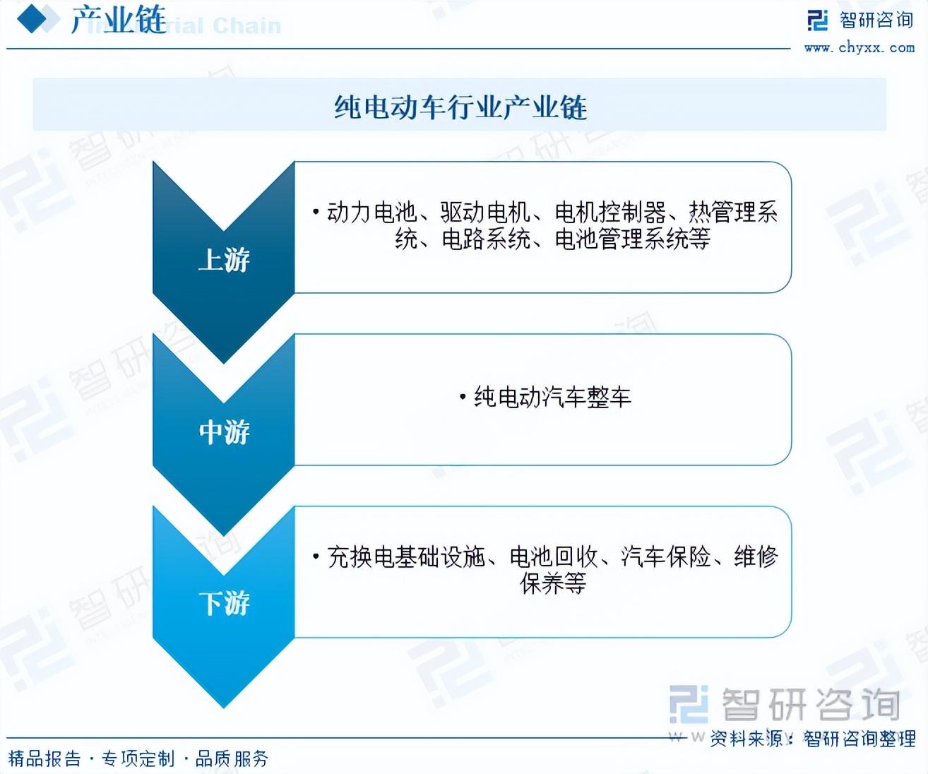 纯电动汽车行业产业链上游为材料部件供应环节,主要包括动力电池、驱动电机、电机控制器、热管理系统、电路系统、电池管理系统等;中游为纯电动汽车整车生产环节;下游主要为配套设备及市场运营环节,主要包括充换电基础设施、电池回收、汽车保险、维修保养等领域。