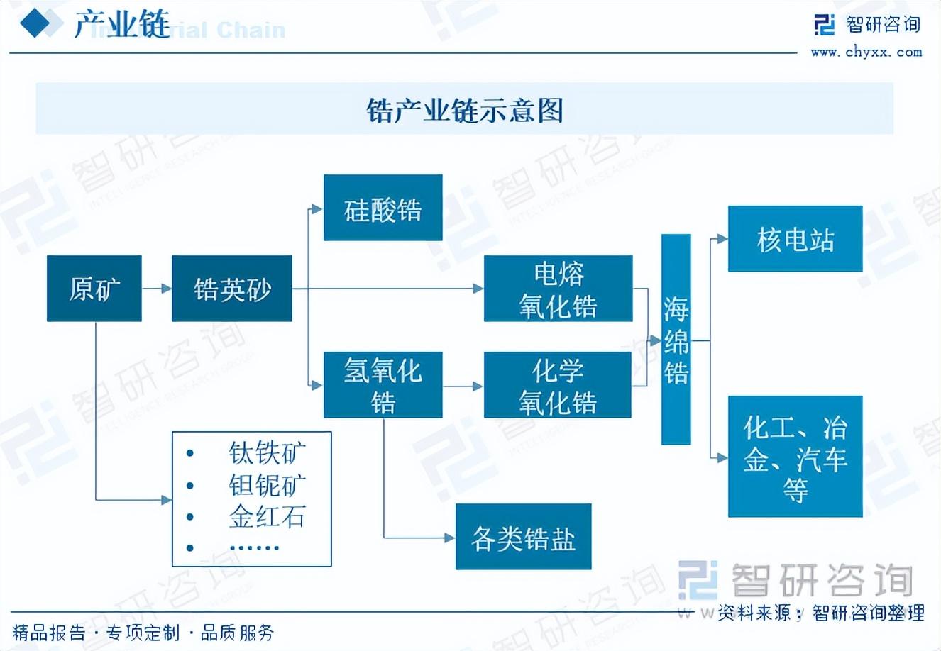 锆产业链上游环节是选矿和精炼,经过初步洗矿后的产品为锆英砂,由于锆矿具有不可再生、不可替代、不可重复利用的特性,而国内中国7成以上锆矿资源为原生锆矿资源,由于选矿难度大和开采成本高等原因,至今尚未完全开采利用,实际可采储量严重不足,而开采的海滨砂矿矿床只能满足国内锆产业部分生产加工需求,导致上游锆矿基本依赖进口;锆英砂经过相关工艺制备得到中游产品主要为氯氧化锆、化学二氧化锆、电熔氧化锆、硅酸锆、复合氧化锆等;下游产品主要为氧化锆陶瓷、海绵锆,海绵锆可分为核电级和工业级,工业级应用较为广泛,包括化工、汽车、冶金和电子等。