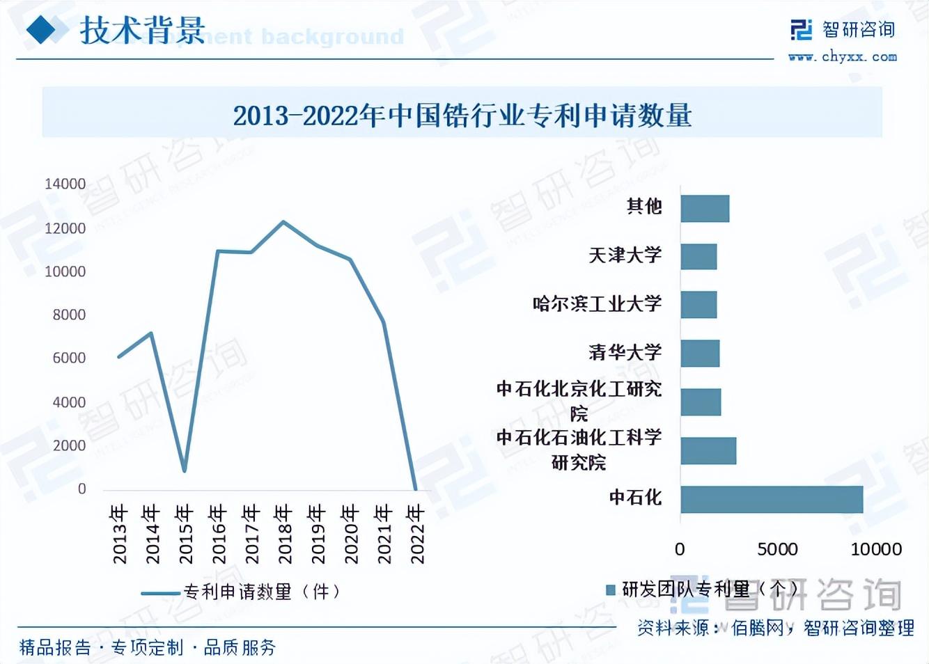 我国锆矿发展背景而言,我国锆整体行业以中游精炼和下游加工为主,目前中国锆行业技术和专利都集中在精炼和加工领域,数据显示我国锆行业专利近年来有所下降,细分研发团队来看,中石化是2013年我国锆行业专业专利数量最多的研发团队。随着中国经济已由高速增长阶段转向高质量发展阶段,在未来十几年内中国对锆矿资源需求仍将保持较大的规模,国内锆矿资源消费结构也将发生重大转变,由传统的硅酸锆陶瓷行业为主逐步向高质量锆化学制品和精密铸造等行业发展。但中国锆矿资源可采储量不足,国内开采和生产的锆英砂产量远不能满足国内需求,中国锆英砂供应大量依赖进口。