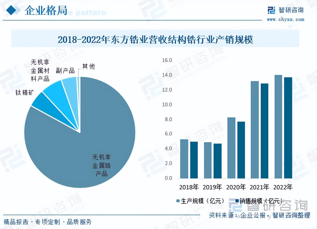 东方锆业是国内最大的锆资源生产企业之一,专注深耕锆行业,产业链上下游选矿和应用协同发展,形成完整锆制品全产业链布局,目前主要业务包含锆钛重矿物开采及精选、锆制品生产等。据其公报数据显示,2018年约以来随着国内锆产业整体稀缺度和需求持续增长,加之企业持续扩张锆相关领域布局,东方锆业整体锆行业营收持续走高,产销规模分别从2018年的5.3亿元和5.02亿元增长至2022年的14.1亿元和13.7亿元,产品结构而言,2022年东方锆业无机非金属锆产品占比超8成,具体而言,据2021年营收结构来看,主要以氯氧化锆、二氧化锆、电容氧化锆和硅酸锆等为主,分别占比31.5%、14.3%、10.3%和5.6%。