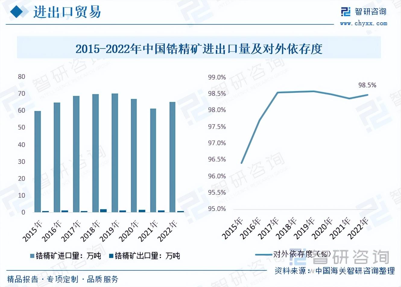 我国锆精矿进出口量变动而言,我国锆矿储量少导致进口依赖度高。数据显示,2015年以来我国锆矿整体进口量都在60万吨以上,且在2020年前表现为稳步增长态势,主要受国内工业和核电等需求走高带动,公共卫生事件影响下整体国际进出口贸易受阻,运输成本高涨,叠加主要企业开工率下降,总体供给量下降加剧了整体供不应求情况进一步至整体锆矿进口均价走高,同时进口量小幅度波动下降又因为需求回升在2022年上涨。具体数据而言,2022年我国锆精矿进出口量分别为65.5万吨和1.1万吨左右,而进口依赖度也随着国内整体需求上行和进口量波动上涨,在2022年已达98.5%。