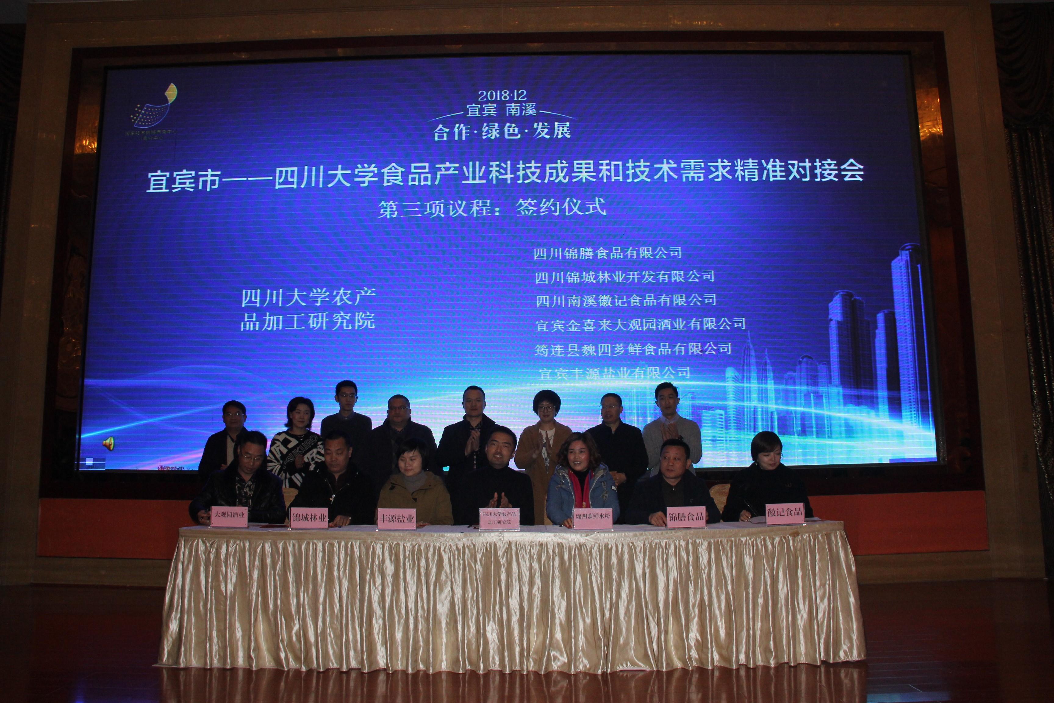 四川大学农产品加工研究院现场与宜宾丰源盐业有限公司、筠连县魏四芗鲜水粉、四川锦城林业开发有限公司、四川锦膳食品有限公司、宜宾金喜来大观园酒业有限责任公司、四川南溪徽记食品有限公司六家食品企业代表签署了项目合作协议。